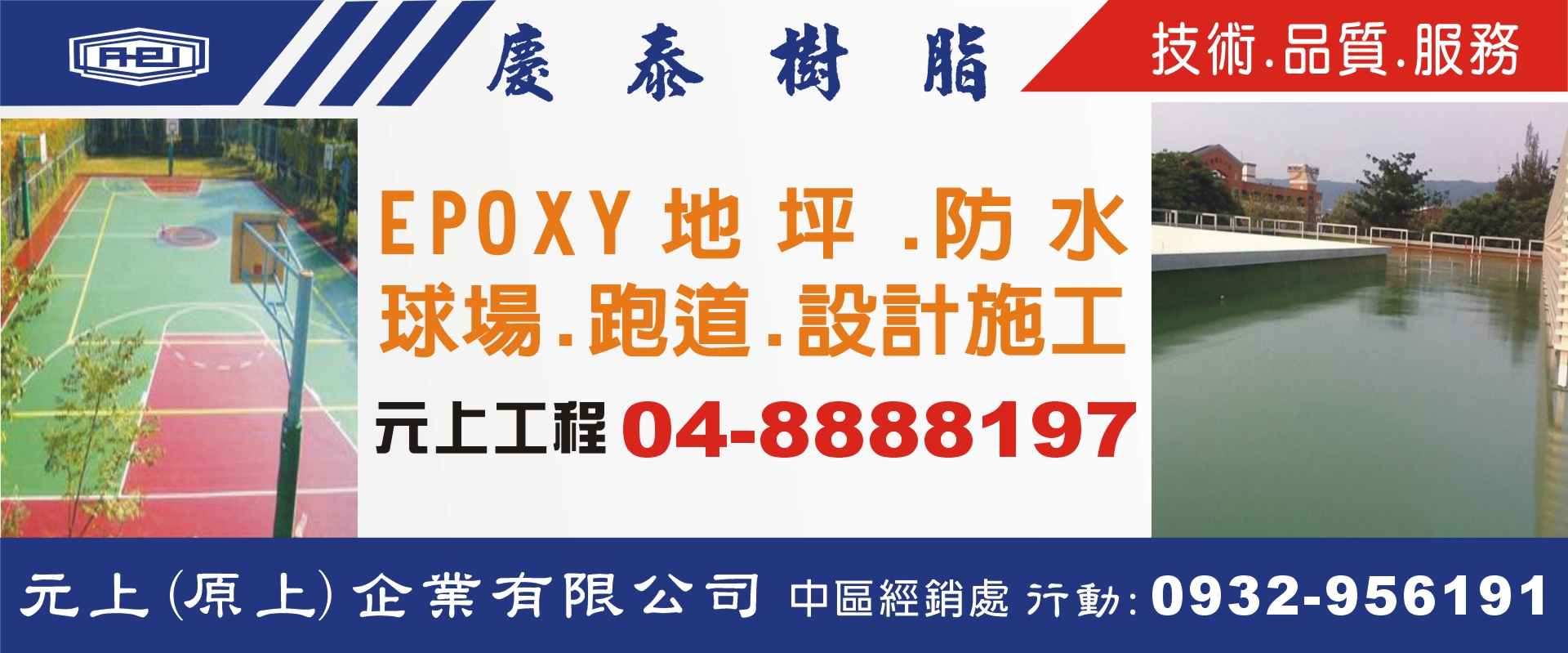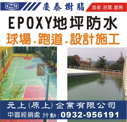 EPOXY地坪、EPOXY防水、聚胺脂、抗菌彩砂優固地床、停車場硬質PU、游泳池、矽酸質防水、球場設計施工、跑道設計施工、耐酸鹼Epoxy無縫無塵地坪、防水工程設計施工、環氧樹脂買賣、無塵研磨、結構裂縫補強、紅磚土買賣、防水防熱、壁癌處理、PU跑道、跑道修補、PU球場、球場PU防水、球場PU地坪、球場修補、DIY防水塗料、高性能聚脲噴塗材料、補漏、補裂工程承攬、環氧樹脂施塗、防水材、球場材、接著劑、止滑劑、水性彈性塗料、水性防水塗料、單液彈泥、耐磨地坪材、慶泰樹脂經銷買賣、彰化EPOXY地坪防水、彰化PU球場跑道設計施工